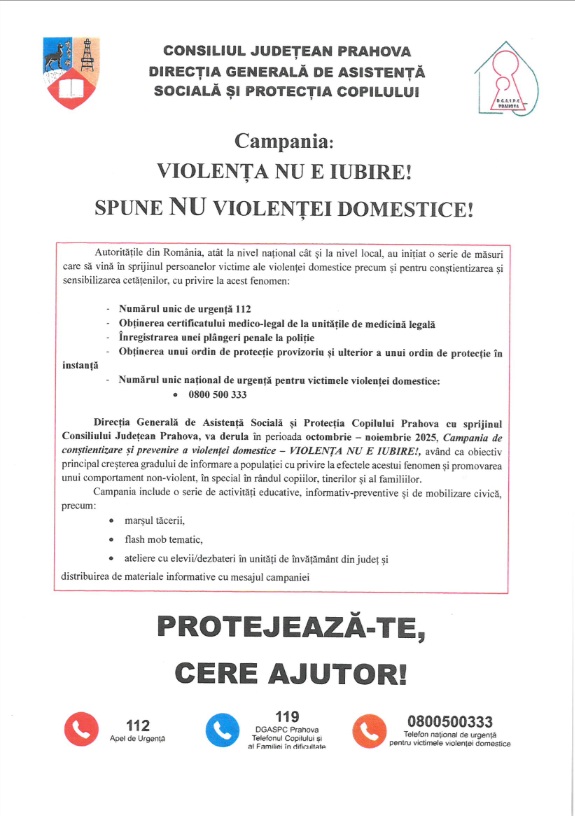 În perioada octombrie – noiembrie 2025, se derulează Campania de conștientizare și prevenire a violenței domestice – VIOLENTA NU E IUBIRE! SPUNE NU VIOLENTEI DOMESTICE!, inițiată de DGASPC Prahova.
